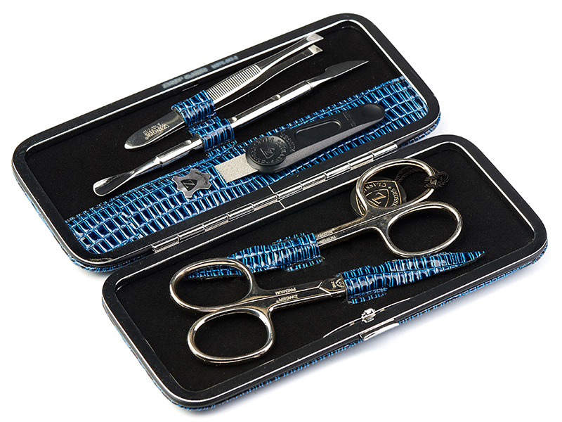 Компактный и прочный футляр с металлическим каркасом изготовлен из натуральной кожи, лицевая сторона декорирована под кожу рептилии. Набор Зингер MSFE-502-1-S содержит 5 инструментов для качественной заботы о ногтях и кутикуле. Инструменты изготовлены из стали и пластика.