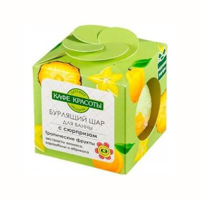 Бурлящий шар для ванн с сюрпризом "Тропические фрукты" Кафе Красоты 120 гр. Натуральный экстракт ананаса карамболы и абрикоса нежно ухаживают за кожей