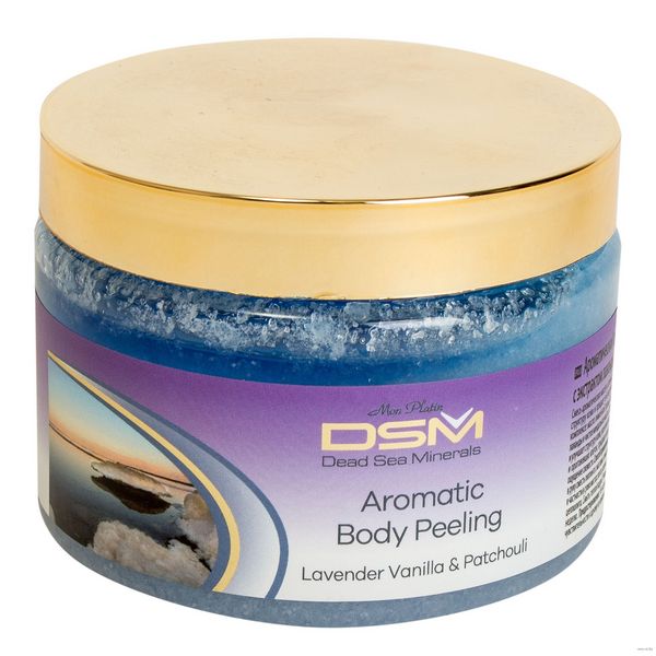 Ароматический пилинг для тела — это смесь ароматических масел лаванды, ванили, пачули и соляных гранул Мертвого моря – улучшает структуру кожи и придает ей эластичность и бархатистость. Масла пачули и лаванды успокаивают кожу, масло ванили укрепляет, питает и освежает кожу; соляные гранулы очищают от омертвевших и ороговевших клеток, придавая коже гладкость и бархатистость, а также ощущение свежести.