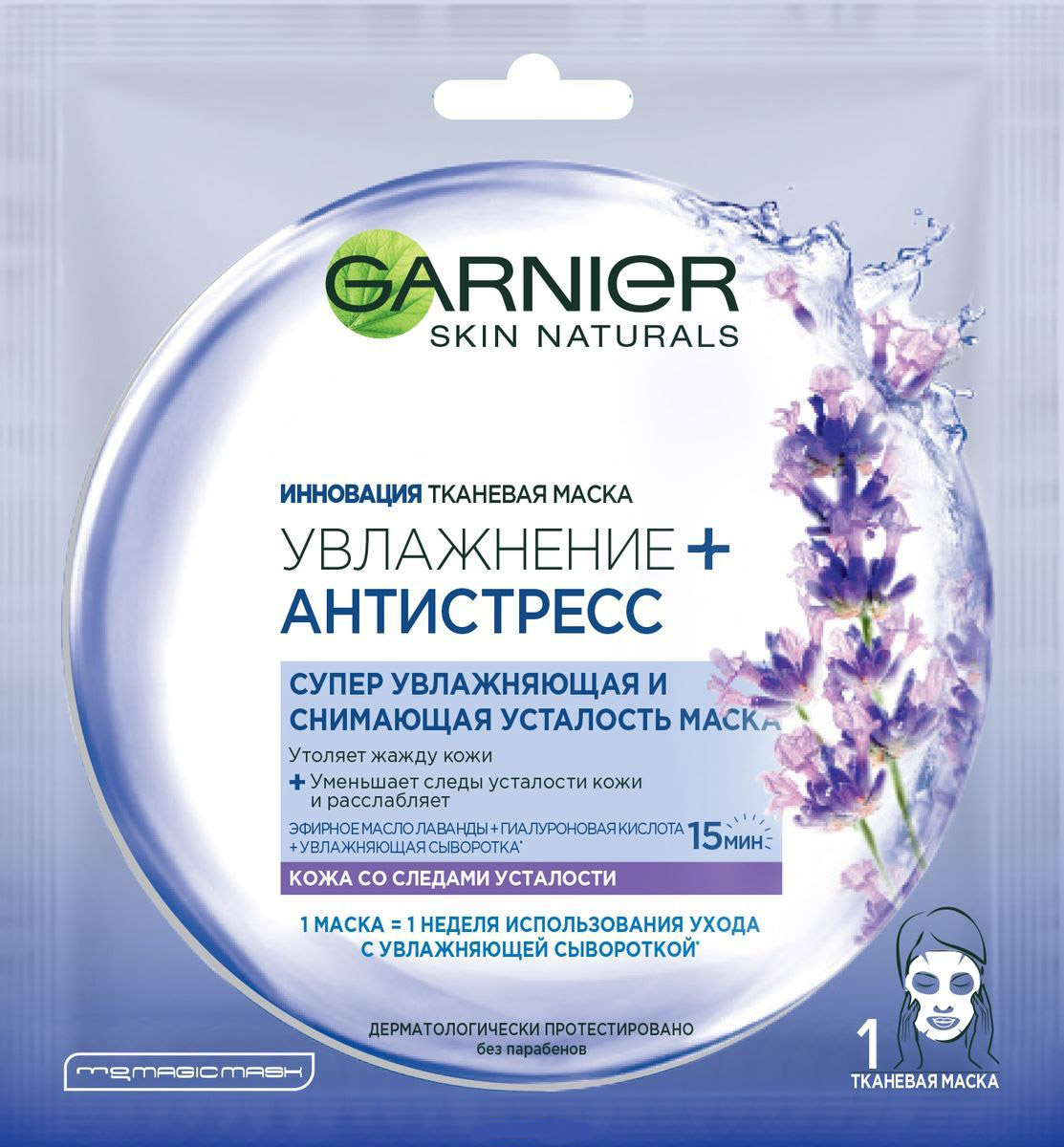 Инновационная тканевая маска пропитана гелем, обогащенным эфирным маслом лаванды, гиалуроновой кислотой и увлажняющей сывороткой. Нанесенная на лицо, маска действует как компресс, уменьшающий следы усталости и увлажняющий глубокие слои кожи. Тканевая маска мгновенно увлажняет Вашу кожу и дарит ощущение комфорта, как после массажа. Это настоящий момент заботы о себе и своей коже и возможность насладиться тонким ароматом лаванды. Подходит для всех типов кожи, даже чувствительной. 1 маска = 1 неделя использования ухода увлажняющей сывороткой.