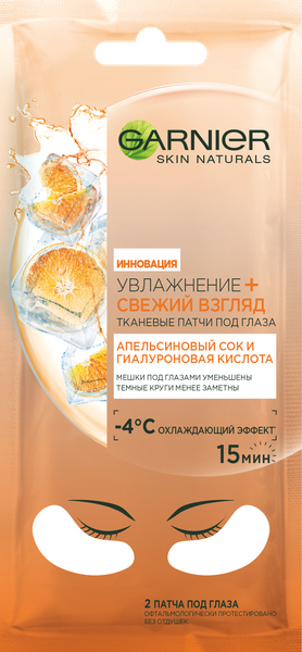 Тканевые патчи для глаз Garnier Увлажнение + Свежий взгляд пропитаны ультралегкой формулой, обогащенной апельсиновым соком и гиалуроновой кислотой. Интенсивно увлажняют и эффективно освежают область вокруг глаз, мгновенно уменьшая мешки под глазами и делая взгляд более отдохнувшим. СУПЕР ОХЛАЖДАЮЩИЙ ЭФФЕКТ: температура кожи снижена на 4'C после применения патчей. Для более сильного охлаждающего эффекта храните в холодильнике.